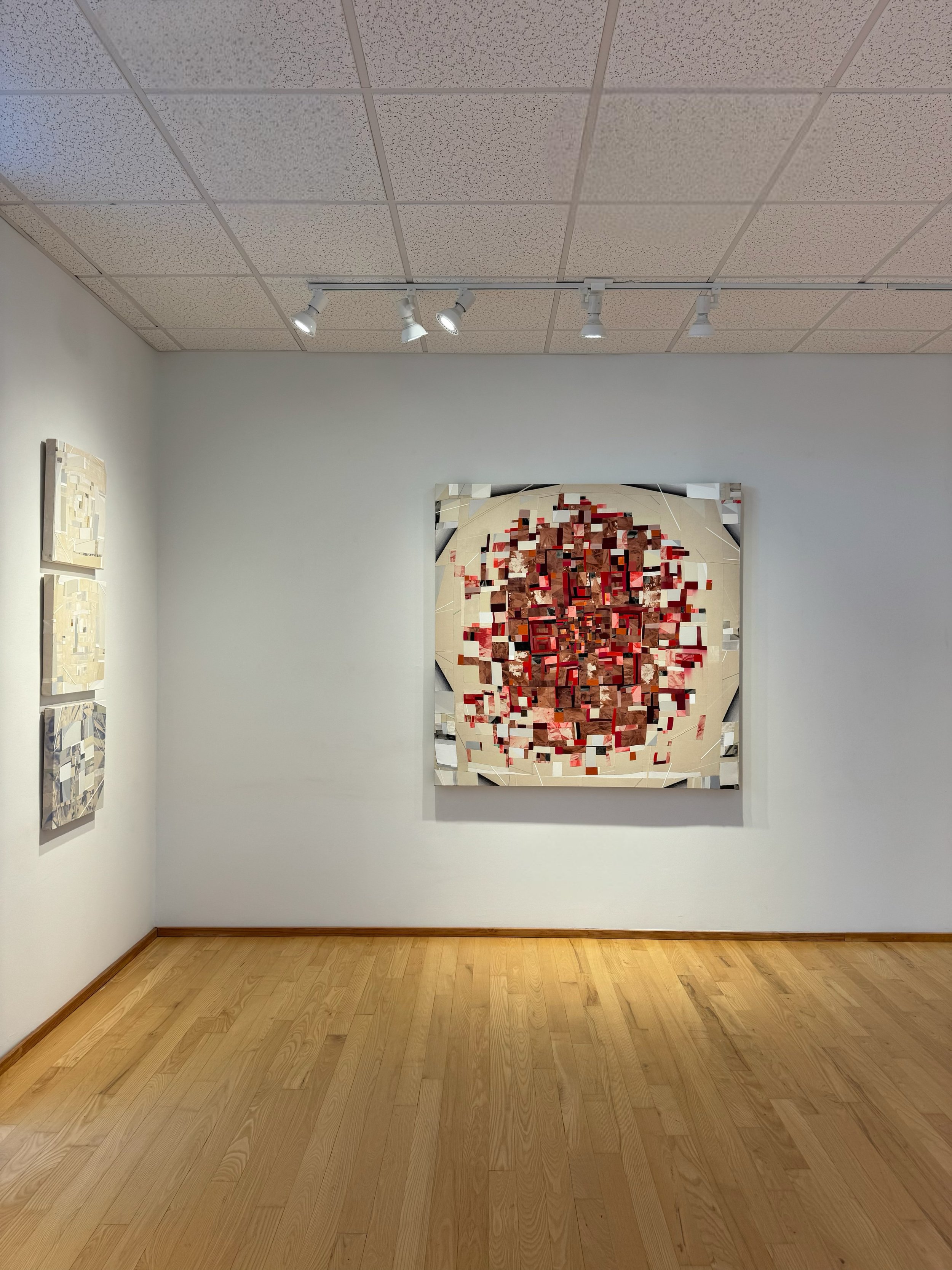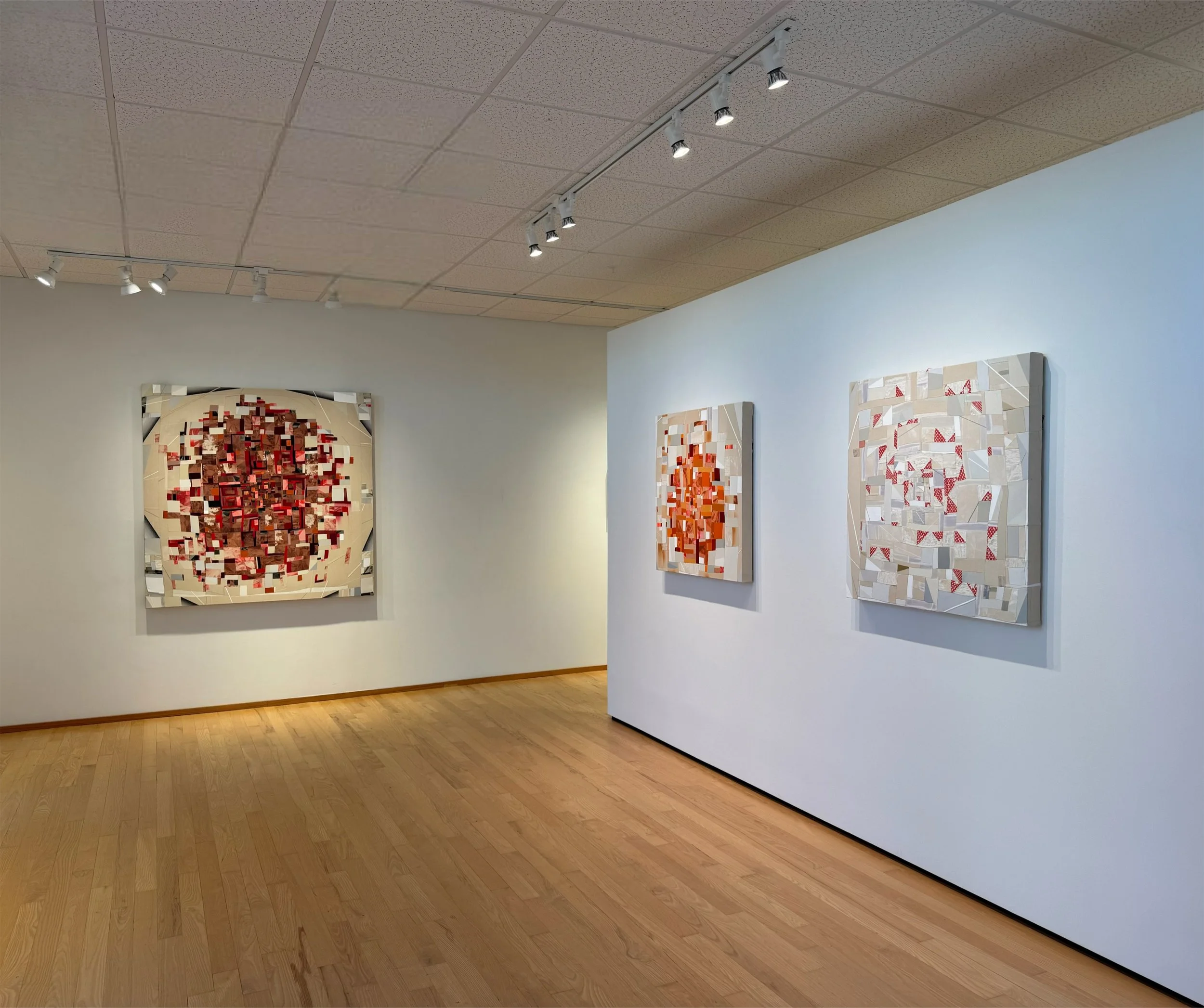 the housetop paintings engage a new color focus for the artist—largely red and white, offset with orange, grey and black. like her last exhibition for the gallery, which took color cues from a blue hued rag rug made by a maternal ancestor of the artist, these paintings talk with textile history. they speak to the history of red and white quilts, especially a red and white quilt campbell thomas made with her mother as a gift for the artist’s eldest son when he left for college. fragments of leftover fabric from that most personal of quilts are present in these paintings, a hidden tie to love, connection and hope made tangible.