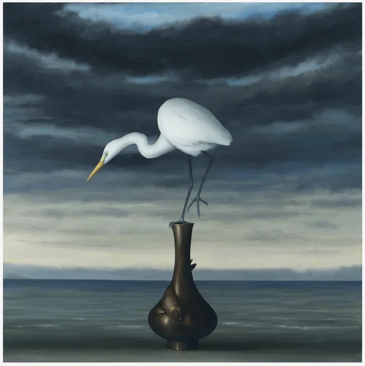 i repeatedly place songbirds, koi, and reptiles in my compositions – delicate and fragile, yet purposeful and assured. a bird rests on a rookwood vase. koi swim powerfully in mid-air, above a blue and white ceramic bowl. an egret hesitates before striking a stoneware fish. do these animals care as much as we do about the difference between human objects and the natural world? and what does any of this have to say about what nature is, or the beauty of nature itself?