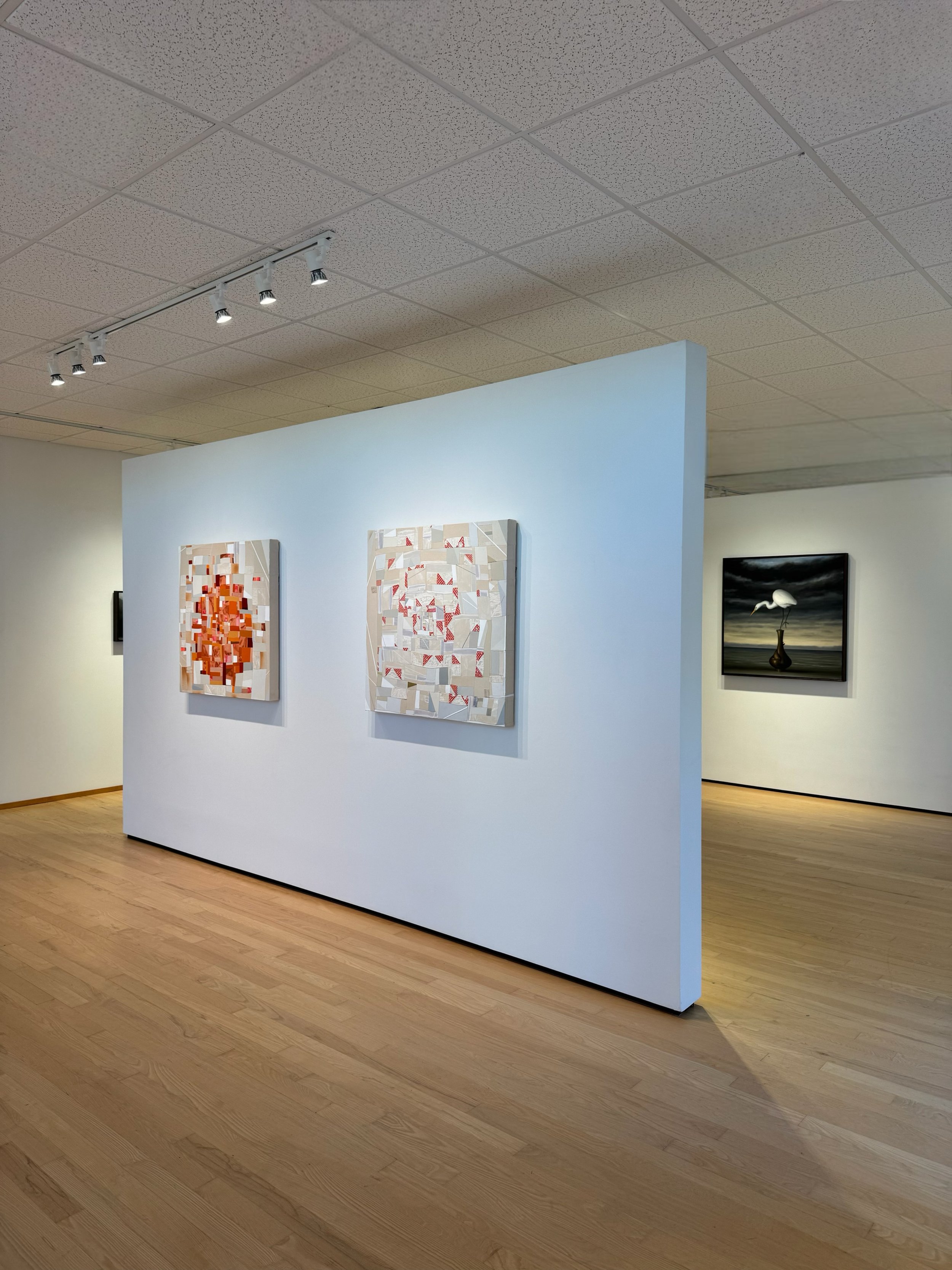 the last exhibition of the year always sneaks up on us. we are super excited to open two new exhibitions to round out 2025 for david kroll and barbara campbell thomas. david kroll is a longtime hidell brooks’ artist. his paintings were included in our inaugural exhibition back in 1998. it has been a pleasure to watch his career from front row seats and every new body of work blows us away again and again. his technique of layers and layers of oil paint built up over months is an arduous task requiring patience and skill honed over years of practice. kroll’s compositions are purposeful and well-thought-out relaying the interplay between the objects. the paintings are meant to be a refuge for the viewer to connect to the natural world. barbara campbell thomas’ acrylic, collage, pieced and sewn fabric on canvas paintings are laborious in a very unique technique stemming from the artist’s family background in quilting. much time is spent laying out the composition while cutting and sewing the fabric onto the canvas. the backs of campbell thomas’ paintings are a blueprint of her work showing the seams sewn in an array of patterns. her current work is focused on housetop quilts using a palette mostly of red and white. barbara’s paintings are very personal through their homage to quilting. just as a quilter would spend hours making a quilt for a loved one, campbell thomas pours as much thought and effort into mapping out every detail of her singular paintings.