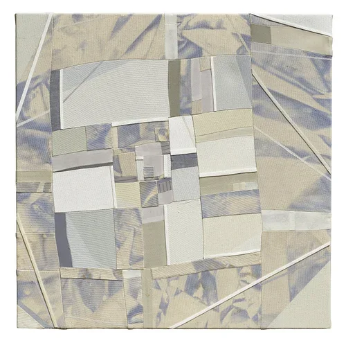 the artist’s signature engagement with geometric abstraction and a densely rich surface of paint, collage and sewn fabric are here, but these formal and material touchstones come alive in new ways through a shifted color palette and the artist’s re-invention of a traditional quilt pattern known as housetop.
