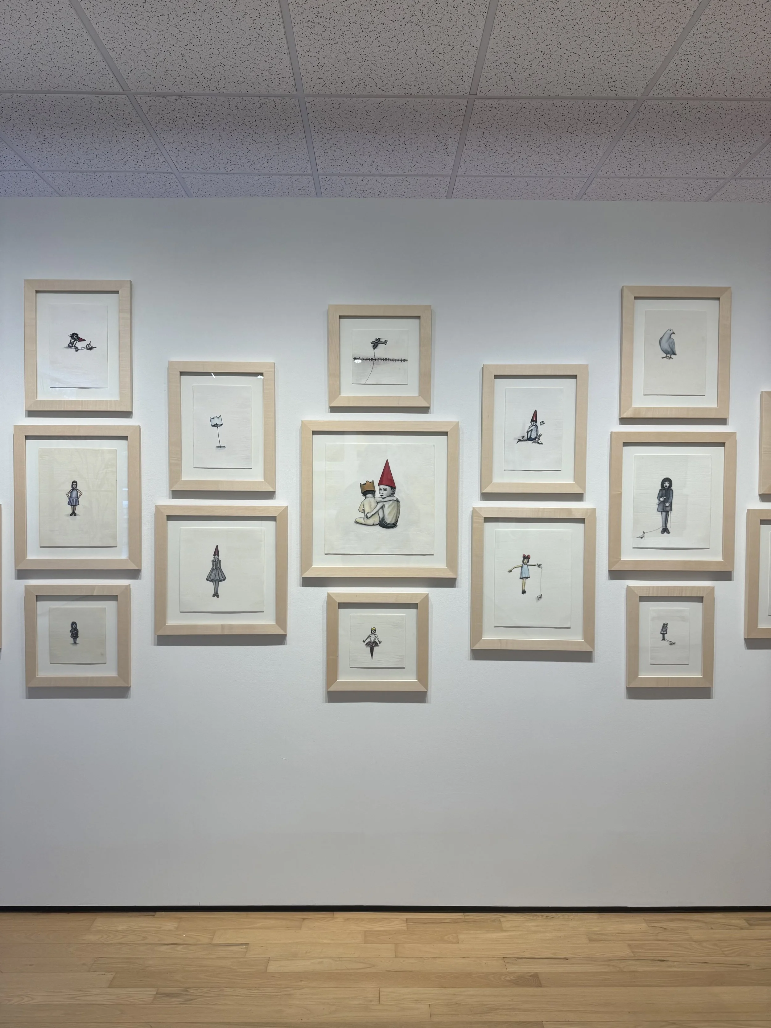 this year has been all about being flexible and along with our regular exhibition schedule leaving room to create opportunities for pop-up shows. in september we visited the studio of longtime hbg artist tony hernandez. we viewed works in progress on wood panel along with a suite of new mixed media and encaustic drawings on paper. immediately we envisioned them exhibited together installed in a grouping to have the most profound effect on the viewer. tony’s drawings are quite special for they are minimal in composition and on the other hand powerful in their message. his visual language includes dunce hats, birds, letters, figures and even planes. all to rejoice in the power of hope and relay every individual is important. the images speak loudly even through their sparseness.
